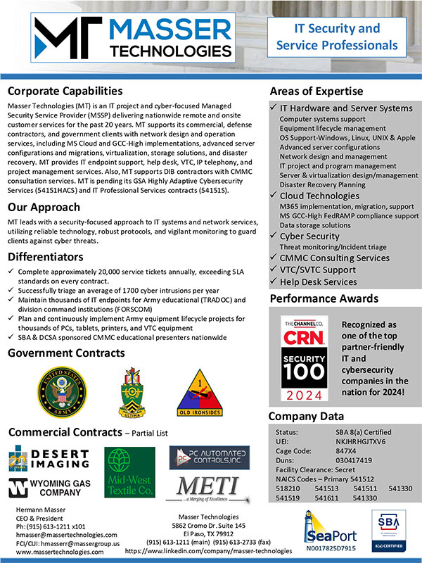 Masser Technologies (MT) is an IT project and cyber-focused Managed Security Service Provider (MSSP) that has delivered nationwide remote and onsite customer services for the past 20 years. MT supports its commercial, defense contractors, and government clients with network design and operation services, including MS Cloud and GCC-High implementations, advanced server configurations and migrations, virtualization environments, storage solutions, and disaster recovery. Additionally, MT provides IT endpoint support, help desk, VTC, IP telephony, and project management services.